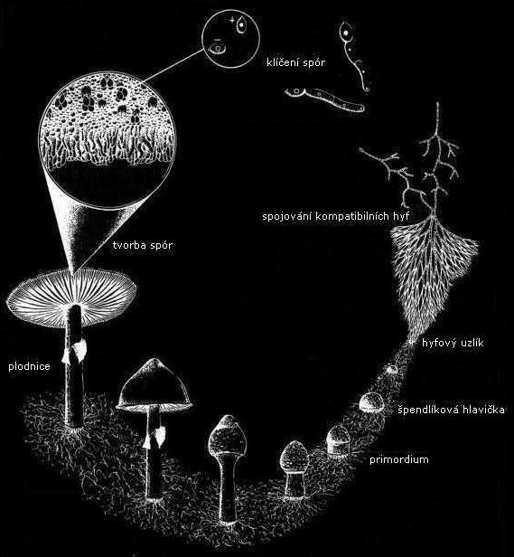 Okrouhlá prohlubeň vtisknutá na konci spory je místem tvorby klíčku, ze kterého vybíhá haploidní pramen mycelia, nazývaný hyfa. Tato hyfa pokračuje v růstu, větví se a stává se z ní síť mycelia. Pokud se setkají dvě pohlavně odlišné sítě, přilnou k sobě a vytvoří spoje, buněčné stěny se rozdělí do dvou hyfových systémů, kde splynou. Změní se cytoplazma a genetický materiál. Erotika nebo ne, takový je houbový sex. od nynějška je výsledné mycelium dvoujaderné a dikaryotické. To znamená, že každá buňka má dvě jádra a plný počet chromozomů. Až na výjimky je pouze mateřské (dikaryotické) mycelium úrodné a schopné tvorby plodnic.